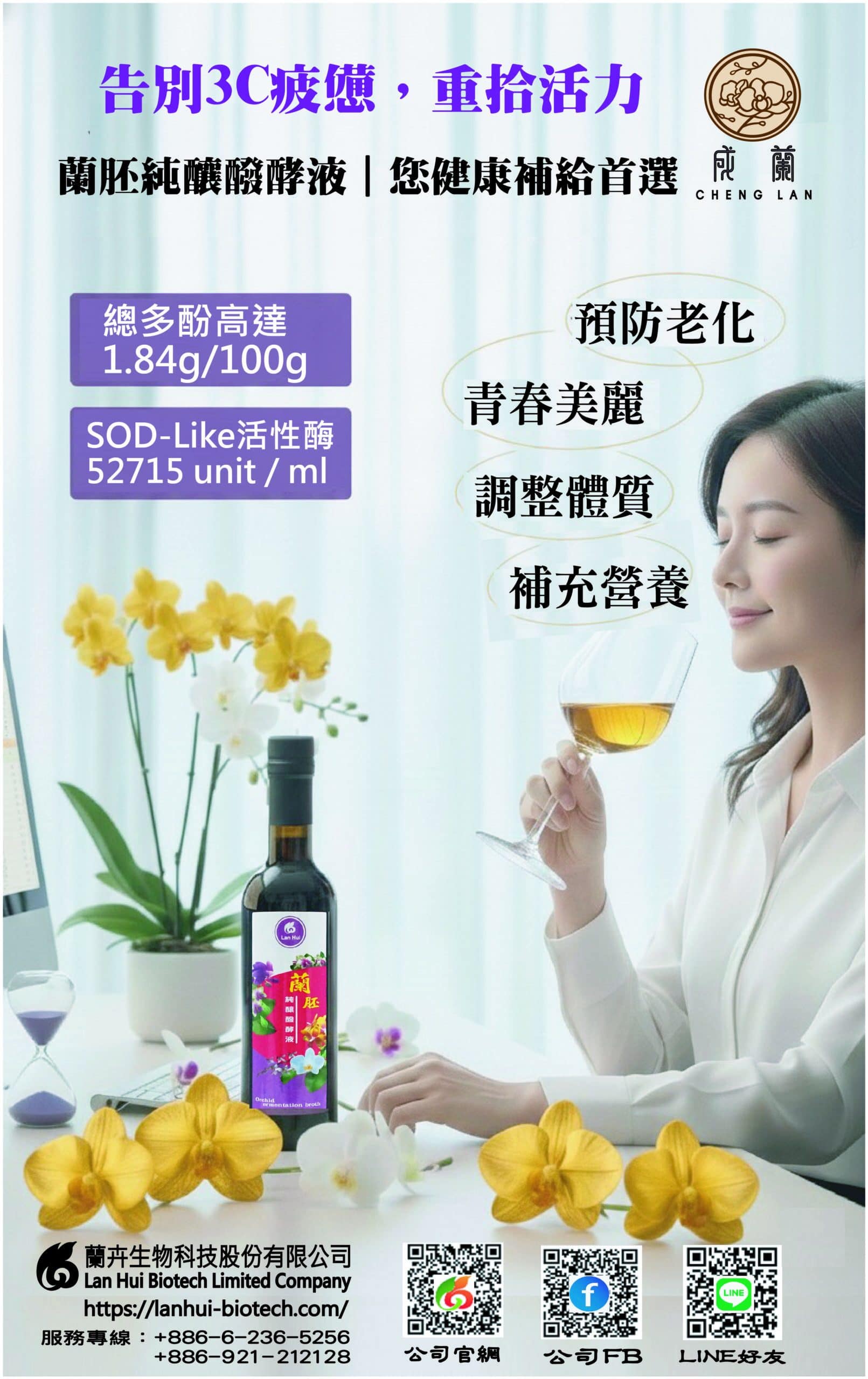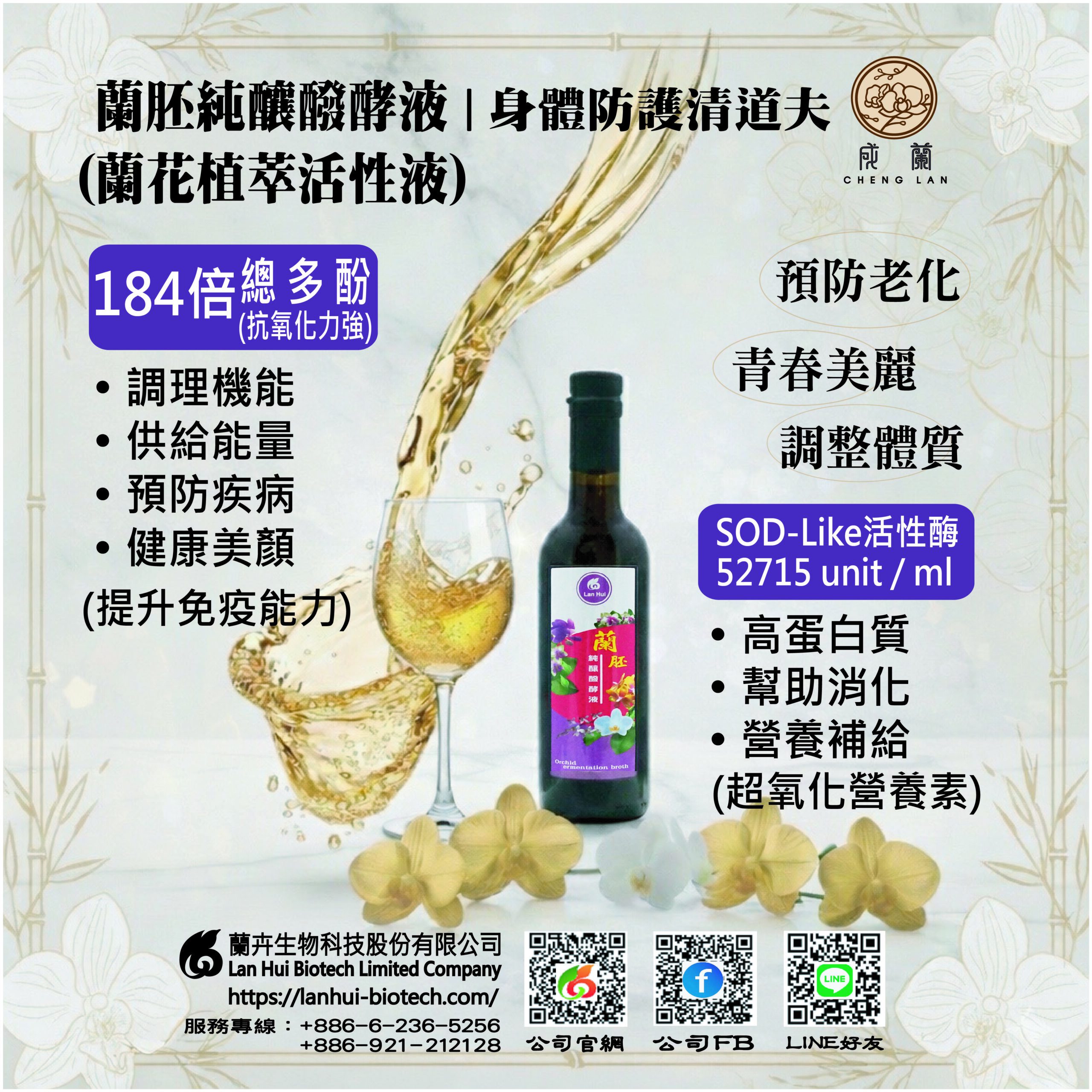 營養成分:蘭胚素、蘭花多酚、花青素、胺基酸、VitC、B1、B2、B6、B12